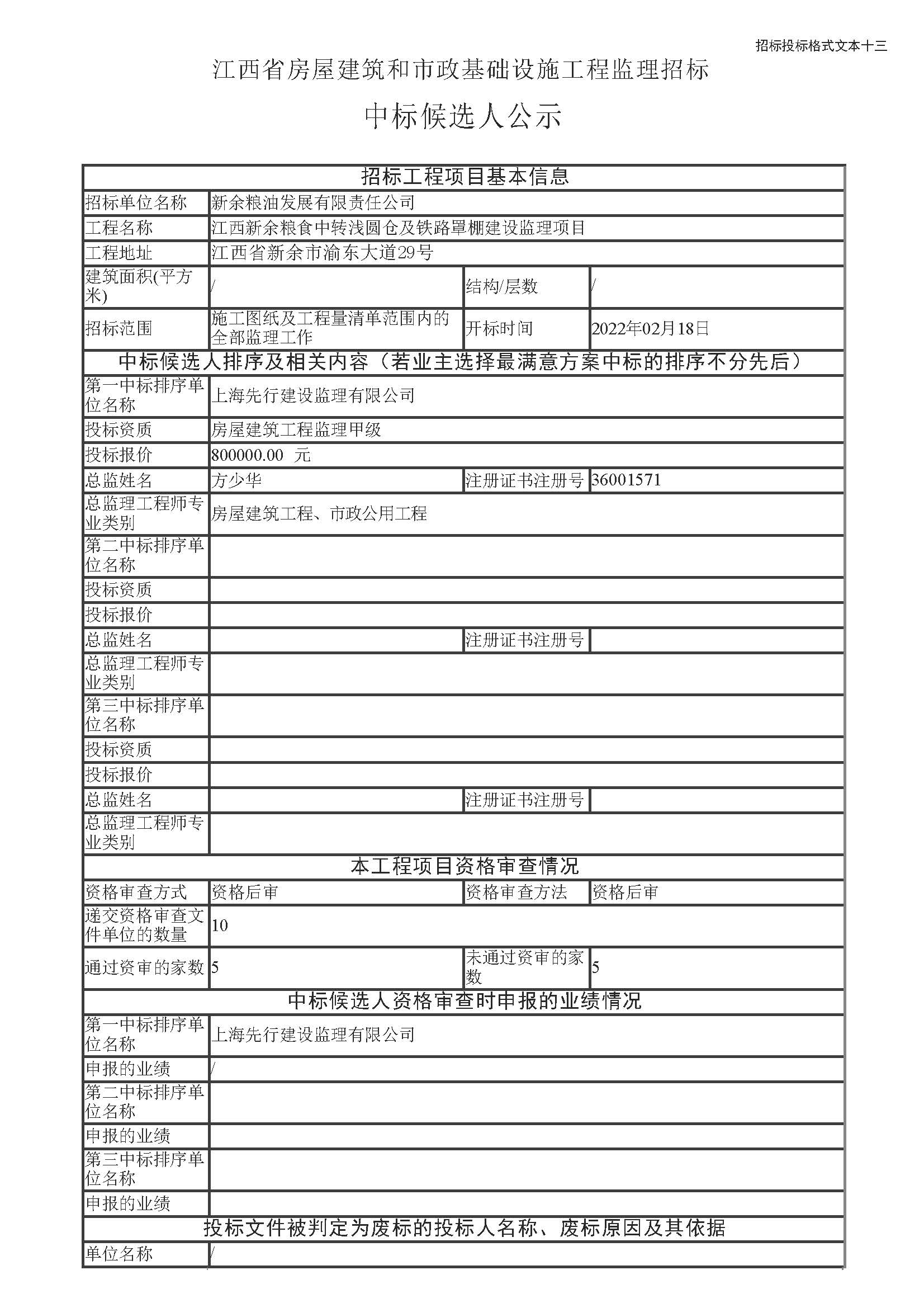 江西新余糧食中轉(zhuǎn)淺圓倉及鐵路罩棚建設(shè)監(jiān)理項(xiàng)目中標(biāo)候選人公示