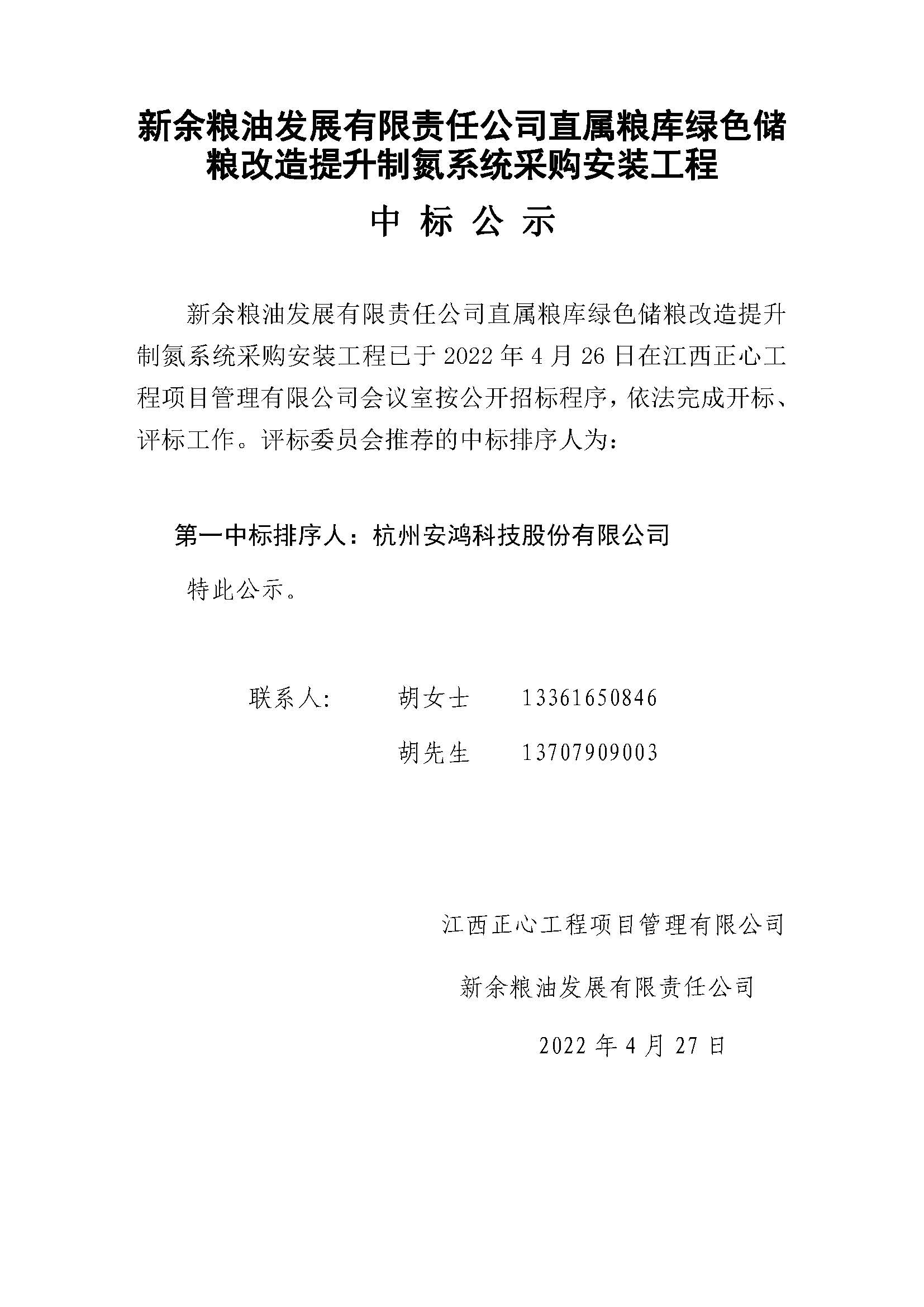 制氮系統(tǒng)采購安裝工程中標(biāo)公示