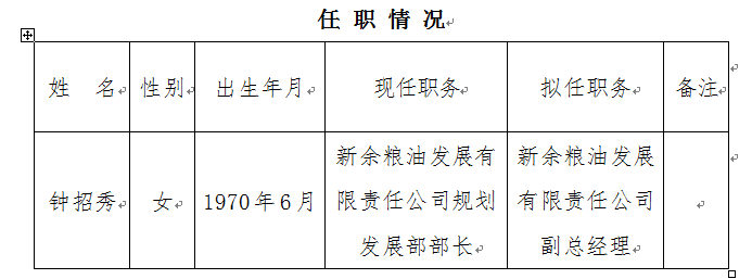 為加強(qiáng)新余糧油發(fā)展有限責(zé)任公司領(lǐng)導(dǎo)班子建設(shè),根據(jù)民主推薦和考察情況,經(jīng)市糧食局黨委研究決定,現(xiàn)將鐘招秀同志擬任職情況進(jìn)行公示,歡迎廣大干部、群眾對(duì)她的德、能、勤、績(jī)、廉和遵紀(jì)守法情況進(jìn)行監(jiān)督,對(duì)公示對(duì)象有反映問題的,可撥打局機(jī)關(guān)黨委電話,聯(lián)系電話:6440672,監(jiān)督電子舉報(bào)信箱:1486273123@qq.com