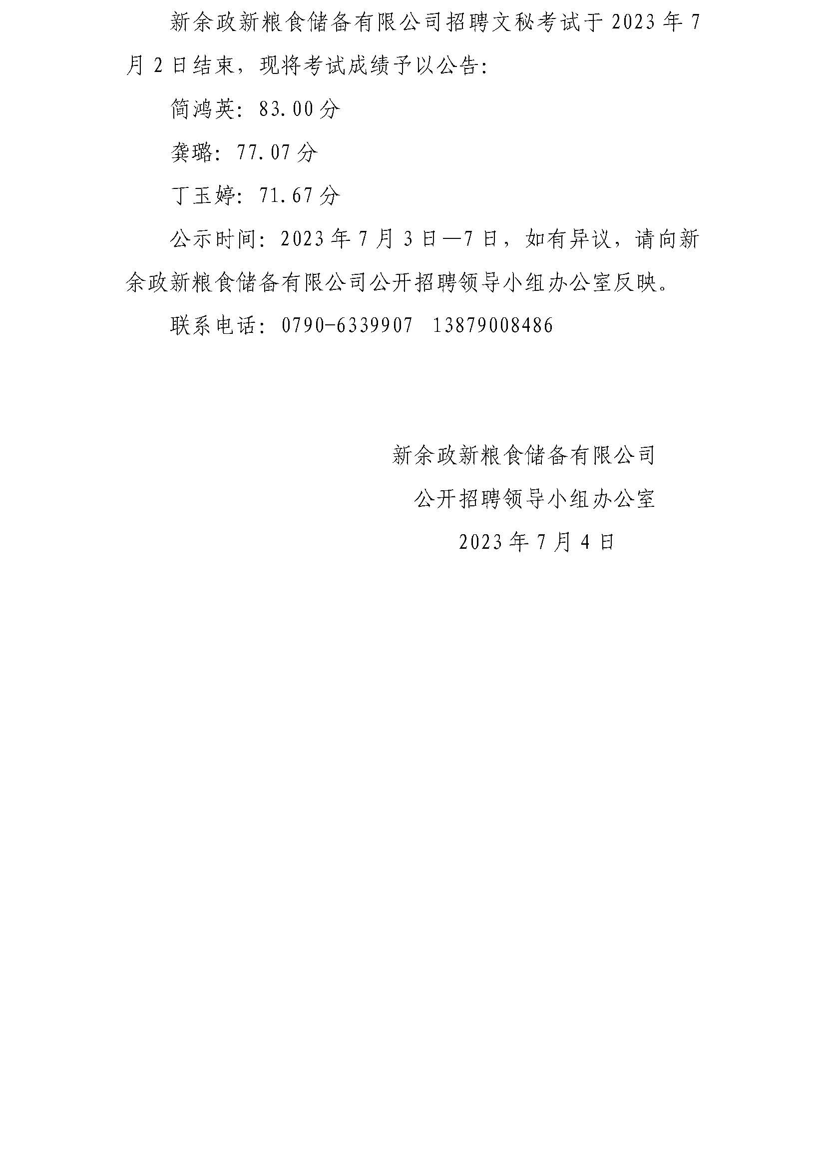 新余政新糧食儲(chǔ)備有限公司招聘文秘考試成績(jī)公告